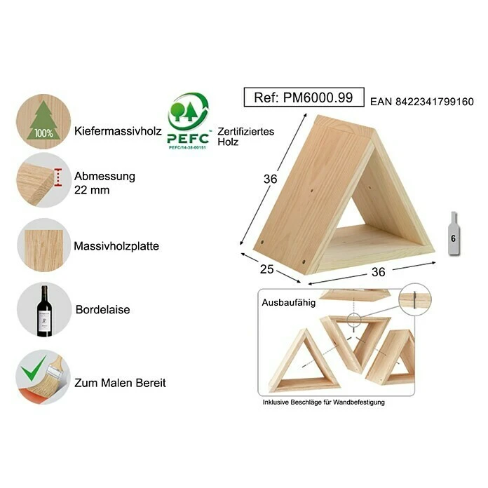 Das Wandregal von Astigarrara bietet verschiedenste Anwendungsmöglichkeiten. Das Regal ist aus natürlichem Kiefernholz gefertigt und mit dem PEFC-Siegel versehen. Die Oberfläche ist unbehandelt, wodurch das Regal seine natürliche Farbe beibehält. Das dreieckige Regal eignet sich zur Aufbewahrung von bis zu sechs Flaschen. Gleichzeitig können in dem Regal dekorativ Bücher, Pflanzen oder Dekoartikel aufbewahrt werden.