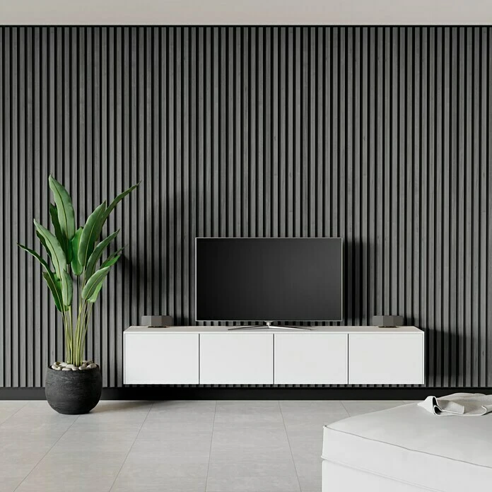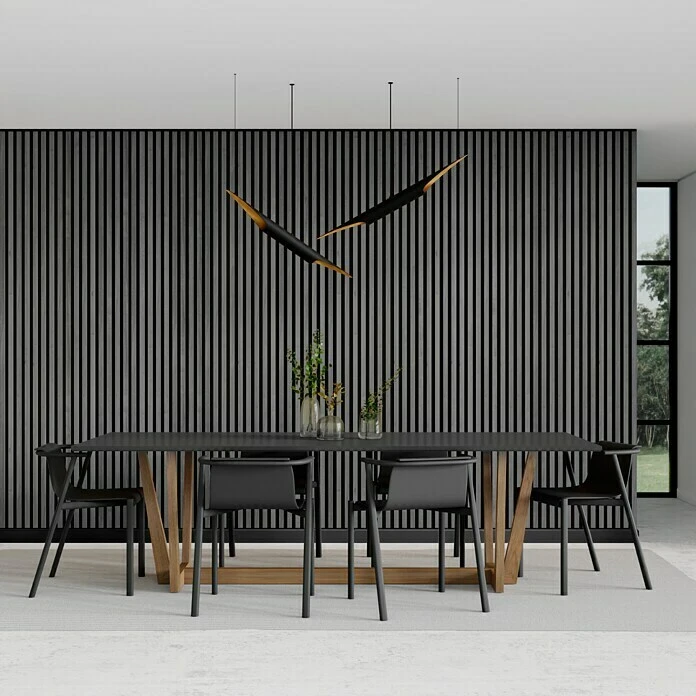 Plus. Die Holzlatten sind aus hochwertigem, gebürstetem Echtholz und zu 100 % recycelbar. Sie sind auf einem 3 mm schwarzen HDF-Träger montiert, der sehr stabil ist und eine schallabsorbierende Wirkung hat. Die Holzlatten werden aus FSC-zertifiziertem Holz, nachhaltig in der EU hergestellt.