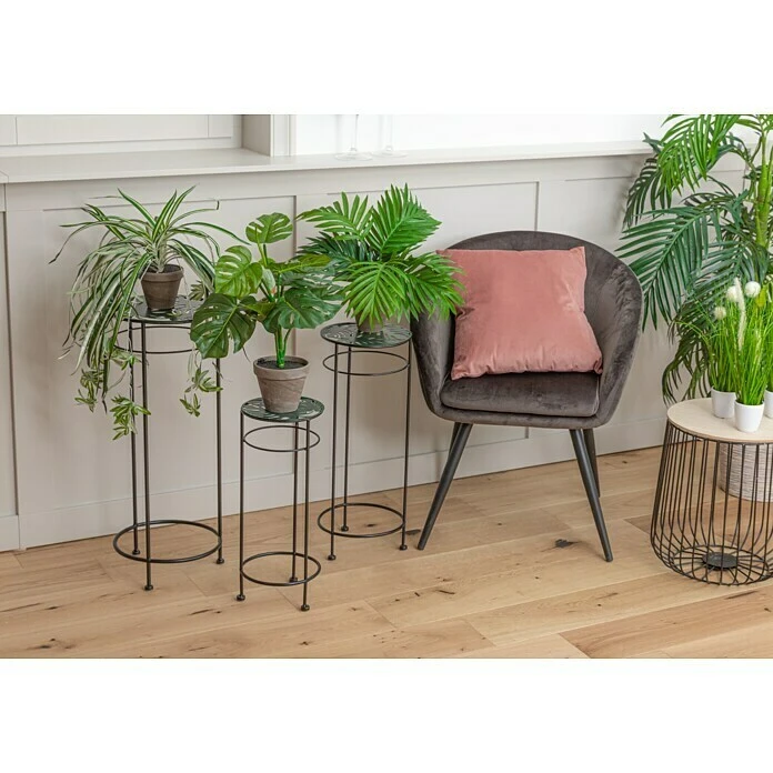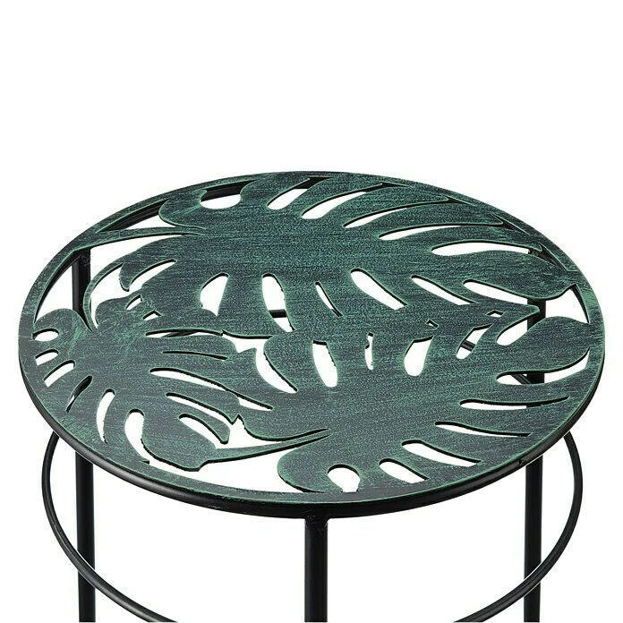 Der Beistelltisch ist mit seinem auffallenden Tischplattenmotiv ein echter Hingucker für jeden Wohnraum und bietet vielerlei Dekorationsmöglichkeiten. Die pulverbeschichtete Tischplatte mit Blattmotiv setzt einen schönen Kontrast, zu den aus Eisen gefertigten, lackierten Tischbeinen. Auch als Dekoobjekt für die Präsentation von Vasen, Blumen und Kunstelementen eignet er sich ideal. Der Beistelltisch ist in verschiedenen Größen erhältlich und kann individuell zusammengestellt werden.