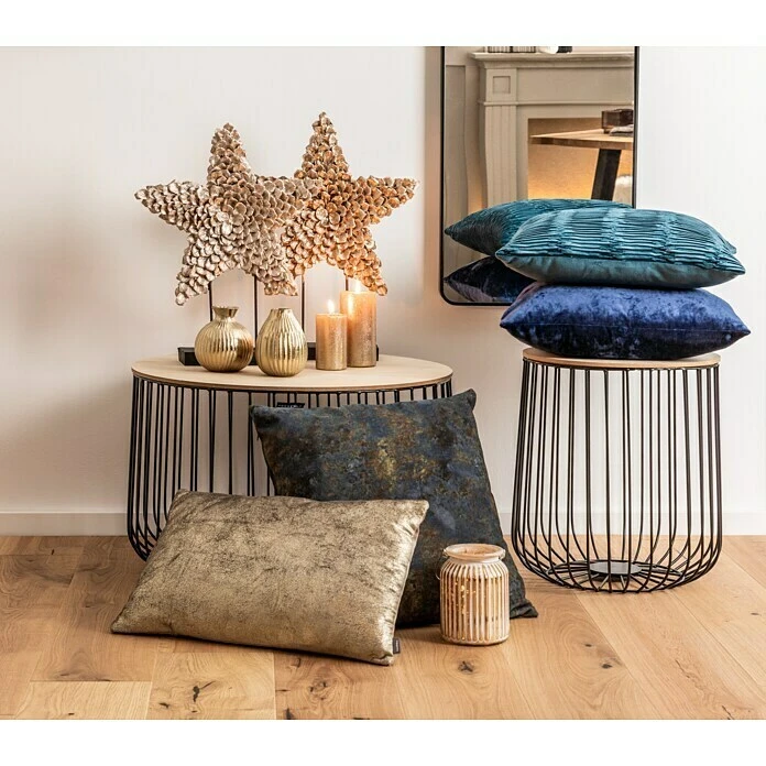 Der Beistelltisch ist in modernem schwarz und einer naturfarbenen Holzplatte ein echter Hingucker in jedem Wohnraum und bietet vielerlei Dekorationsmöglichkeiten. Der Metallkorb-Tisch fügt sich durch sein skandinavisch minimalistisches Design in nahezu jeden Einrichtungsstil hervorragend ein und sorgt für ein gemütliches Wohnambiente. Die Tischplatte setzt einen interessanten Kontrast zu dem aus Metall gearbeiteten Gestell – in Kombination lockert der Tisch den Raum auf und wird zu einem absoluten Eyecatcher.