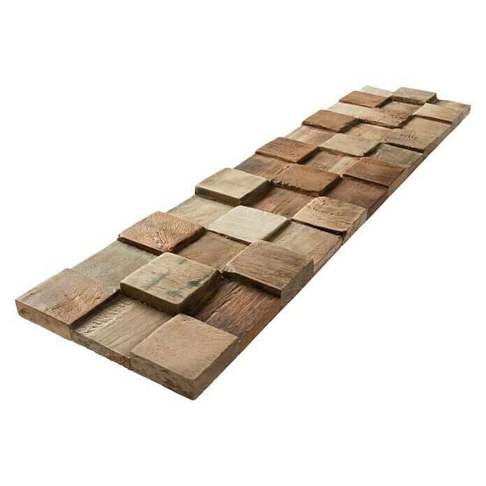 Die Holzpaneele sind aus wiederaufbereitetem Teakholz gefertigt. Egal ob nur eine kleine Fläche oder ganze Wände mit den Holzverblendern verkleidet werden – individuellen Gestaltungsideen sind keine Grenzen gesetzt. Die natürliche rustikale Farbgebung sowie der 3D-Effekt sorgen für eine ausdruckstarke Wandverkleidung im Wohnbereich.