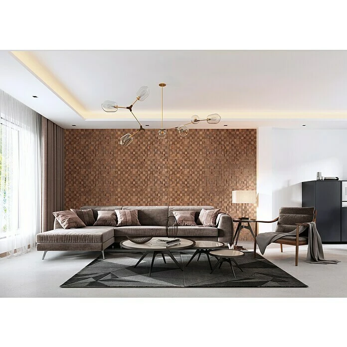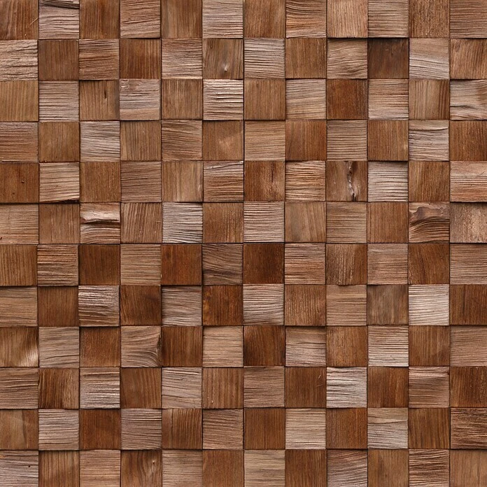 Die Holzpaneele Quadro aus gespaltenem Holz sind eine gelungene Kombination aus grafischem Design und natürlicher Ausstrahlung von echtem Holz. Das Spiel mit der Maserung unterstreicht die lebendige Wirkung dieser Wandverkleidung. Die imprägnierten Elemente im quadratischen Format 38 x 38 cm lassen sich leicht mit handelsüblichem Montagekleber anbringen.