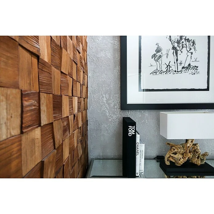 Die Holzpaneele Quadro aus gespaltenem Holz sind eine gelungene Kombination aus grafischem Design und natürlicher Ausstrahlung von echtem Holz. Das Spiel mit der Maserung unterstreicht die lebendige Wirkung dieser Wandverkleidung. Die imprägnierten Elemente im quadratischen Format 38 x 38 cm lassen sich leicht mit handelsüblichem Montagekleber anbringen.