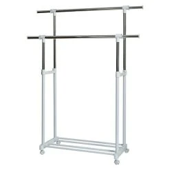 Der Kleiderständer XXL eignet sich zum Verstauen von Jacken und Schuhen. Er ist mit einer doppelten Teleskopkleiderstange ausgestattet um ein Maximum an Stauraum zur Verfügung zu stellen. Der Kleiderständer lässt sich einfach, ohne Schrauben, durch ein Stecksystem aufbauen und lässt sich dank der Rollen bequem verschieben. Die Belastbarkeit beträgt 30 kg/Stange.