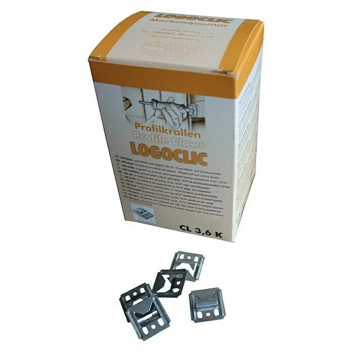 Die Logoclic Paneelkrallen CL 3,6 K sind Spezialkrallen für die Logoclic Wand- und Deckenpaneele der Produktlinien Variation und Decoration zum Heften oder Nageln. Die Form der Kralle ist dem Klickprofil der Paneele mit geringer Nuttiefe und einer Deckbreite bis 13 cm angepasst.