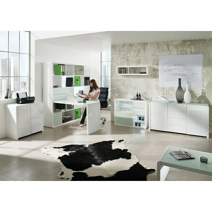 Der Türcontainer Atlanta von Phönix lässt sich ideal in alle Atlanta Regale, Sideboards oder Lowboards einsetzen und ermöglicht ganz individuelle Gestaltungsmöglichkeiten. Hinter der durch eine Push-Open-Funktion zu öffnenden Tür befindet sich ein großes Fach, welches ausreichend Stauraum für Bücher, Ordner oder kleinere Haushaltsgegenstände bietet. Die Tür besitzt eine farblich abgesetzte, hochglänzende Glasfront.