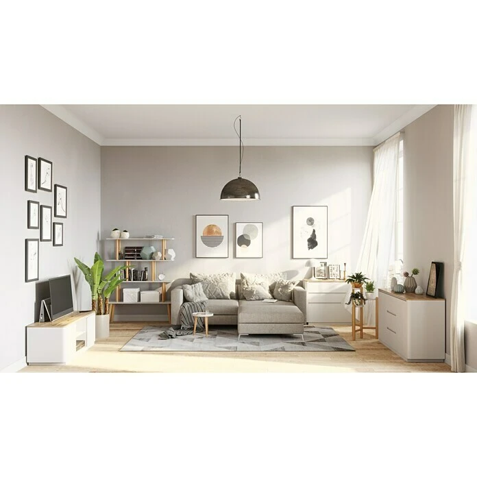 Der Beistelltisch Buffalo von Phönix weist eine runde Tischplatte auf, die von drei stabilen Tischbeinen gestützt wird. Die Beine bestehen aus Massivholz und setzen so einen schönen farblichen Kontrast zu der weißen Tischplatte. Die Farbenkombination integriert das Möbelstück in den modernen Scandi-Style. Durch den schmalen abgesetzten Rand auf der Platte können abgestellte Gläser oder darauf platzierte Gegenstände nicht herunterfallen.