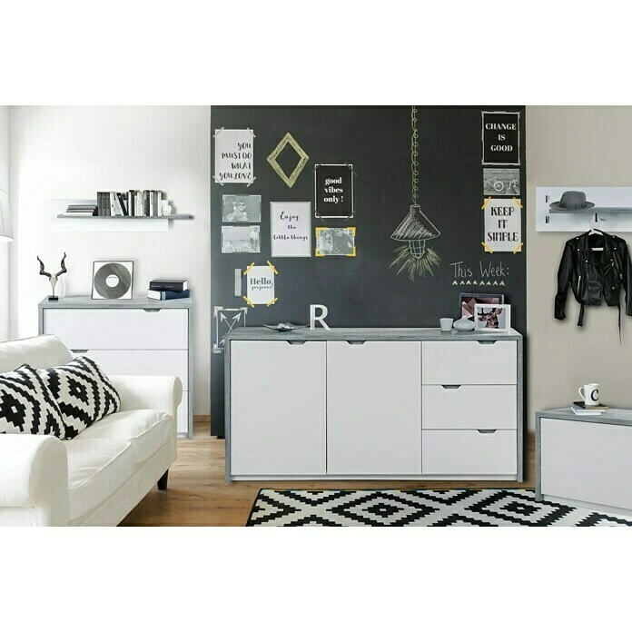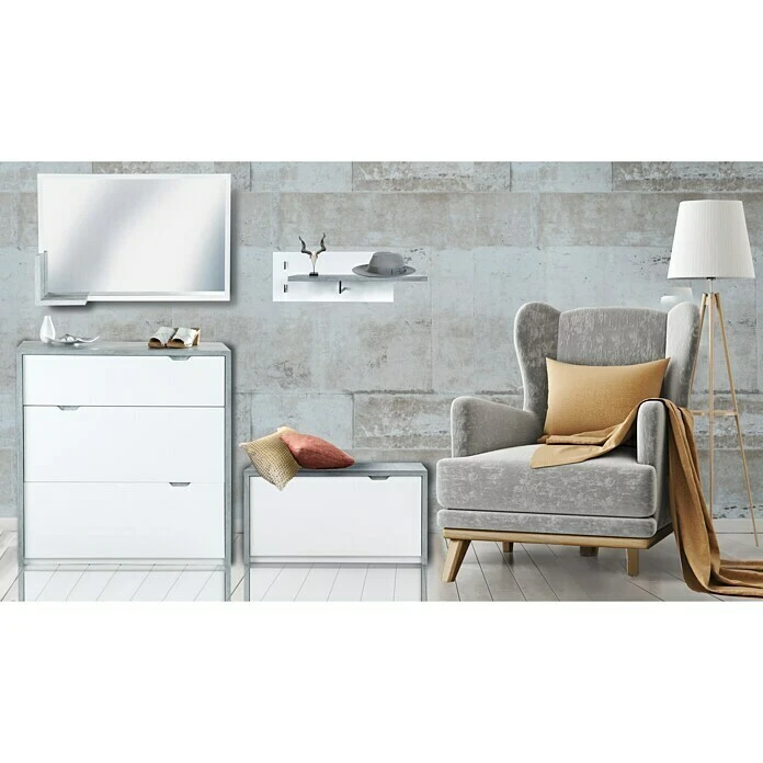 Die Garderobenleiste Bruno von Phönix verfügt über zwei Haken und eine Kleiderstangen und bietet optimalen Platz für die eigene Garderobe. Eine Ablagefläche ermöglicht die Ablage von Hüten, Schals oder Handschuhen. Die Haken und Kleiderstange haben eine chromglänzende Beschichtung. Die Ablagefläche ist in Betonoptik gehalten und das Garderobenboard ist weiß lackiert. Die Garderobenleiste hat eine Traglast von bis zu 35 kg und lässt sich gut mit anderen Produkten der Serie Bruno kombinieren.