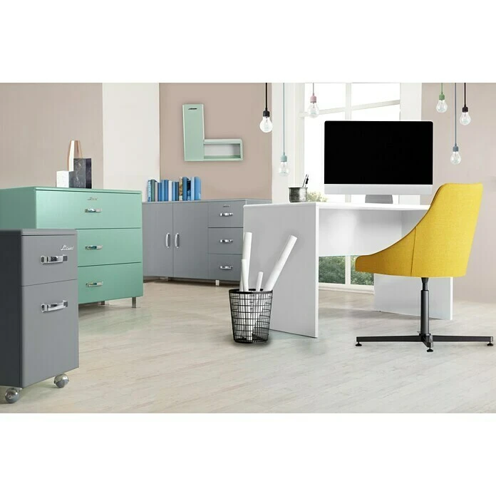 Der Schreibtisch Miami von Phönix ist in schickem Retro-Look gehalten und mit einer schützenden Autometallic-Lackierung versehen, die als besonderer Hingucker in Ihrem Büro dient. Der Tisch weist abgerundete Ecken auf, wodurch Verletzungen bei Gegenstößen verhindert werden. Mit einer Plattentiefe von 65 cm bietet der Schreibtisch genügend Fläche für bequemes Arbeiten, ohne Ihr Büro vollkommen zu überfüllen.