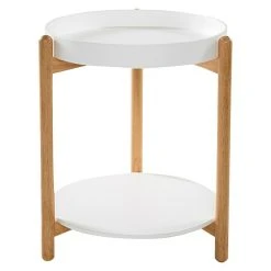 Der Beistelltisch Rubby von Phönix überzeugt durch das schlichte und moderne Design, das durch die braun-weiße Farbgebung an den trendigen Scandi-Look angelehnt ist. Das Gestell des Beistelltisches besteht aus robustem und naturbelassenem Bambusholz. Die Ablagefläche sowie das Tablett sind aus leichtem Metall gefertigt. Das Tischchen eignet sich als Beisteller neben Sofas, Sesseln oder Betten. Da der runde Beistelltisch keine Seiten- oder Rückwände hat, ist der Zugang von allen Seiten bequem möglich.