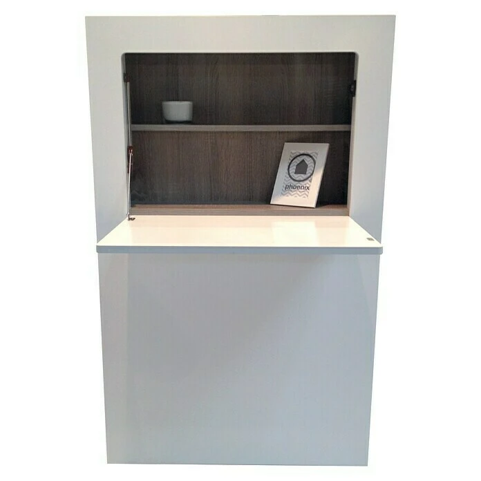 Der Wandschreibtisch Milano von Phönix überzeugt durch seine einklappbare Schreibtischfläche und seinen versteckten Stauraum. Er bietet nicht nur Arbeitsfläche für Laptop oder Computer, sondern auch viel Aufbewahrungsmöglichkeiten für Ordner oder Schreibutensilien. Somit eignet er sich besonders gut für Wohnräume mit wenig vorhandener Fläche. Das untere Türfach ist beidseitig montierbar und die zwei Fächer sind mit insgesamt drei Einlegeböden ausgestattet. Durch eine Kabelöffnung vom oberen zum unteren Fach können PC und Desktop verbunden werden.