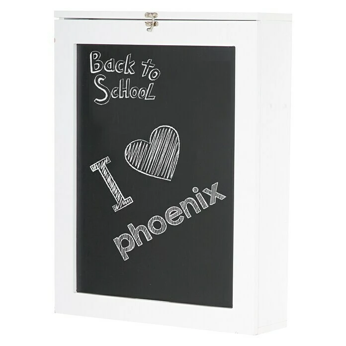 Der Wandschreibtisch York von Phönix lässt sich als Schreibtisch oder zusammengeklappt als Tafelfront verwenden. Im Regal gibt es ausreichend Fächer für Dokumente oder Schreibutensilien und mithilfe der drei Haken lassen sich auch Schlüsselanhänger verstauen. Der Schreibtisch ist platzsparend und kann im Kinderzimmer, im Büro oder auch als kleiner Küchentisch genutzt werden. Der Schreibtisch ist ganz in Weiß gehalten und lässt sich daher mit anderen Möbelstücken kombinieren.