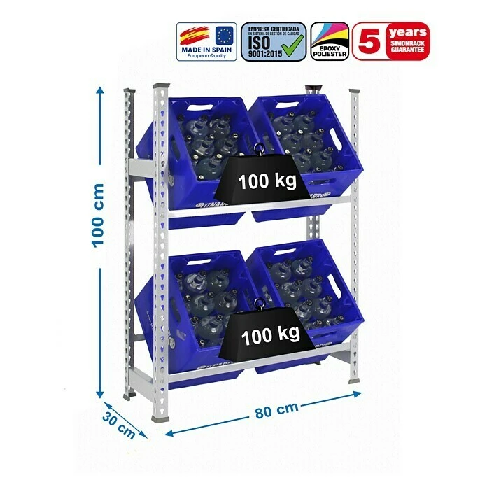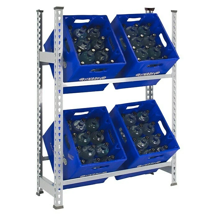 Das Getränkekistenregal Bottleclick von Simon Rack eignet sich ideal zur Einlagerung von bis zu Getränkekisten in Vorratsräumen, Werkstatt oder Garage. Das stabile Regal verfügt über mehrere Ebenen mit einer jeweiligen Traglast von 100 kg. Dank der schrägen Lagerung der Kisten ist die Flaschenentnahme jederzeit problemlos möglich. Die Montage gestaltet sich dank des Stecksystems sehr einfach.