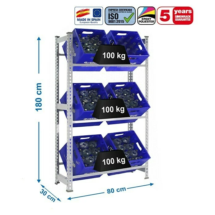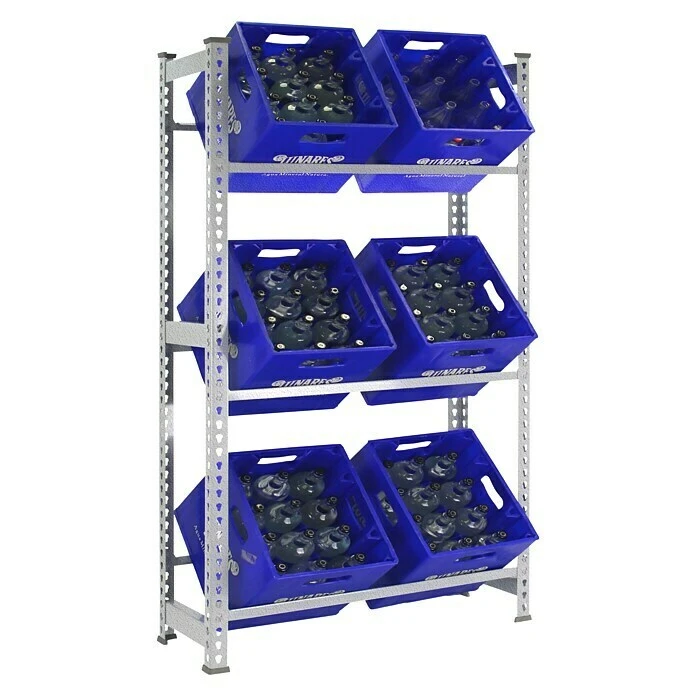 Das Getränkekistenregal Bottleclick von Simon Rack eignet sich ideal zur Einlagerung von bis zu Getränkekisten in Vorratsräumen, Werkstatt oder Garage. Das stabile Regal verfügt über mehrere Ebenen mit einer jeweiligen Traglast von 100 kg. Dank der schrägen Lagerung der Kisten ist die Flaschenentnahme jederzeit problemlos möglich. Die Montage gestaltet sich dank des Stecksystems sehr einfach.