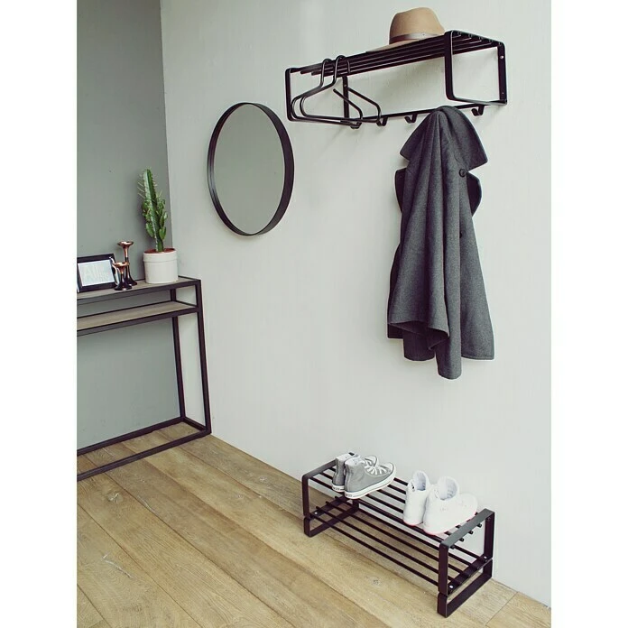 Die Garderobenleiste Rex 2 von Spinder Design verfügt über 5 Haken an denen Jacken, Mäntel und andere Kleidungsstücke aufgehängt werden können. Sie besticht durch ihr zeitloses Design und verleiht jedem Wohnambiente einen modernen Charakter. Optisch passt die Garderobenleiste perfekt zu dem Spinder Design Schuhregal Rex SR. Hergestellt aus hochwertigem Stahl, hält die Garderobenleiste mühelos dem Gewicht mehrerer Kleidungsstücke stand. Die Stangen an der Oberseite dienen als Ablagefläche für Hüte oder andere Accessoires. Alternativ können an den Stangen auch Kleiderbügel angebracht werden. Die Garderobenleiste Rex 2 wird mit Hilfe von vier Schrauben an die Wand montiert.