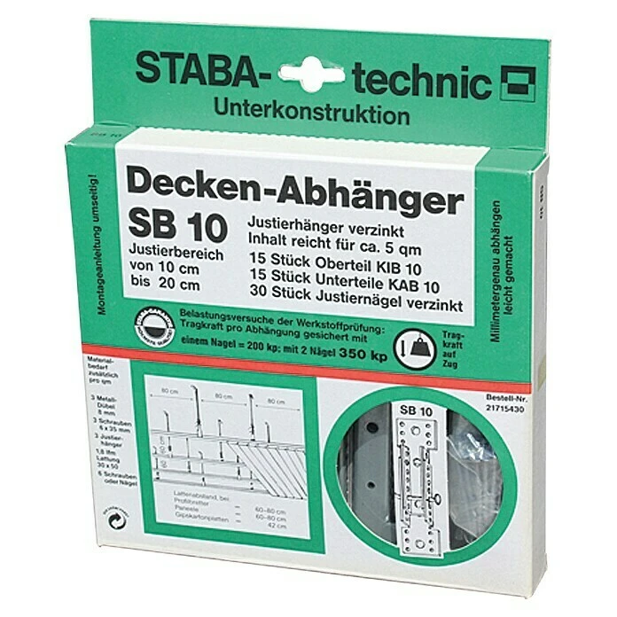 Die Staba Deckenabhänger SB 10 ermöglichen ein millimetergenaues Abhängen in einem Justierbereich von 10 – 20 cm. Die verzinkten Justierhänger können durch Umbiegen der Befestigungsflächen zusätzlich die Abhängelänge kürzen. Die Justierhänger müssen nach oben geschraubt und können zur Seite geschraubt oder genagelt werden. Je nach Spannweite bzw. Tragkraft des Holzes (ca. 60 – 80 cm) wird der Hänger auch beidseitig angesetzt. Nach endgültiger Justierung des Abhängers sichert das Umbiegen des Justiernagels die eingestellte Abhängelänge.