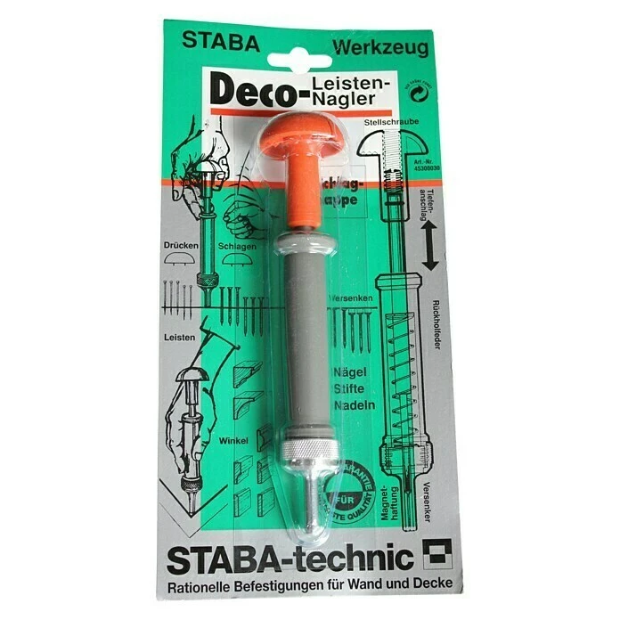 Beim Staba Deco-Leistennagler handelt es sich um einen Nagler und Versenker mit stufenlosem Tiefenanschlag zur manuellen Befestigung von Zier- und Dekorleisten, Bodenleisten sowie Rahmen. Der Universalnagler kommt in jeden kleinen Winkel und ist mit einem stufenlosen Tiefenanschlag ausgestattet. Vor Inbetriebnahme des Werkzeugs ist die Stellschraube in der Schlagkappe nach unten zu drehen. Dann einfach Nägel (Länge bis 25 mm) drücken und schlagen.