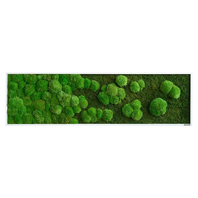 Das Besondere an diesem Wandobjekt ist der Verlauf von einer sanften, hellen Kugelmoos-Landschaft in eine dunklere Waldmoosfläche. Da die Moose echt und zu 100 % natürlich konserviert sind, kann das Moosbild nur in Innenräumen aufgehängt werden. Die Pflanzen benötigen aufgrund der hochwertigen Konservierung keine Pflege und sind viele Jahre haltbar. Der Rahmen besitzt an der Rückseite Ösen zur Wandmontage. Dadurch kann das Wandobjekt sowohl vertikal als auch horizontal montiert werden.