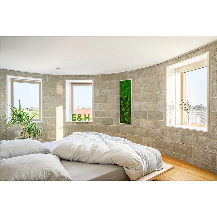 Es besteht aus einem hochwertigen, weißen, FSC®-zertifizierten Vollholz-Rahmen, welcher mit verschiedenen Moos- und Pflanzenarten begrünt ist.