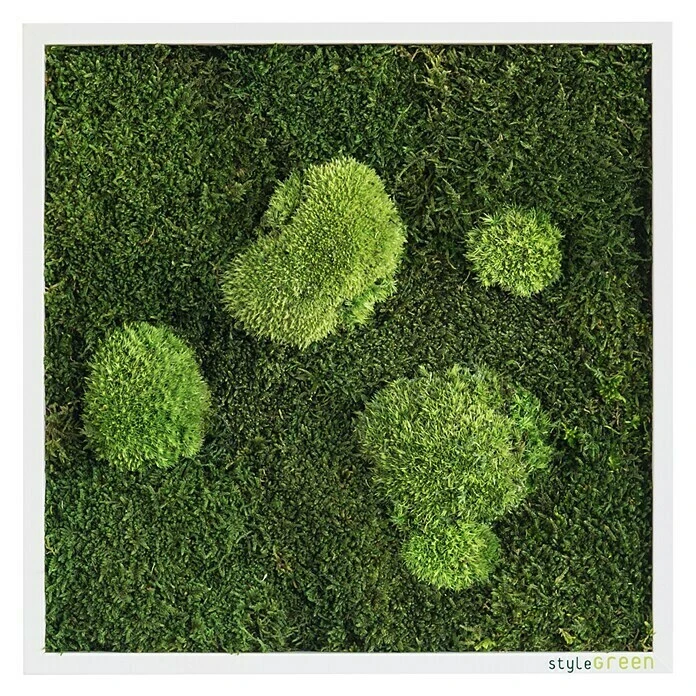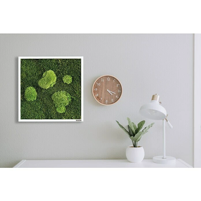 Es besteht aus einem hochwertigen, weißen, FSC®-zertifizierten Vollholz-Rahmen, welcher mit verschiedenen Moos- und Pflanzenarten begrünt ist. Da die Moose echt sind und zu 100 % natürlich konserviert sind, kann das Moosbild nur in Innenräumen aufgehängt werden. Die Pflanzen benötigen aufgrund der hochwertigen Konservierung keine Pflege und sind viele Jahre haltbar. Der Rahmen besitzt an der Rückseite Zacken-Aufhängungen zur Wandmontage. Dadurch kann das Wandobjekt sowohl vertikal als auch horizontal montiert werden.