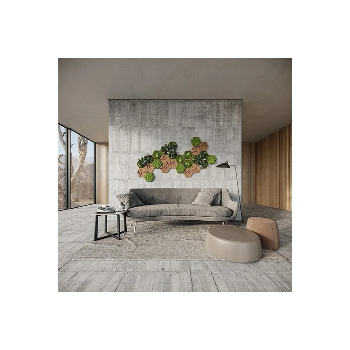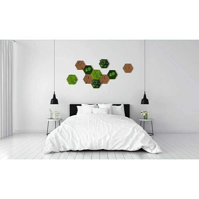 Die Wanddeko-Set Hexagon von styleGREEN ist mit seiner einzigartigen Optik ein schöner Blickfang in jedem Wohnraum. Es besteht aus einem natürlichen Kork, welcher mit verschiedenen, echten Moos- und Pflanzen bepflanzt ist. Da die Moose echt und zu 100 % natürlich konserviert sind, kann das Moosbild nur in Innenräumen aufgehängt werden. Die Pflanzen benötigen aufgrund der hochwertigen Konservierung keine Pflege und sind viele Jahre haltbar.