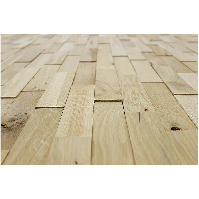 Die Wodewa Echtholzriemchen aus Eiche bieten jede Menge Möglichkeiten für die individuelle Innenraumgestaltung mit Holz. Mit der 3D-Holzdekoration gelingt es schnell und einfach Zimmerwände zu gestalten. Die Anwendung ist sowohl für große Flächen als auch kleine Akzente geeignet. Das Anbringen der Massivholzwandverkleidung ist auf allen tragfähigen, glatten und festen Untergründen möglich. Eine optimale Tiefenimprägnierung durch modernste Fertigungstechnik mit mehrmaligem Auftrag gewährleistet einen zuverlässigen Oberflächenschutz vor Feuchtigkeit und Verschmutzung. Die Wodewa Holzwandverkleidung kann mit einem weichen feuchten Tuch, einem Staubwedel oder durch Absaugen einfach gereinigt werden. Dank der drei verschiedenen Materialstärken entsteht eine außergewöhnliche 3D-Optik. Die freie Verlegung garantiert ein Unikat als Fläche. Natürliche Wuchsmerkmale und Farbabweichungen sind ein Beweis dafür, dass es sich um echtes Holz handelt.