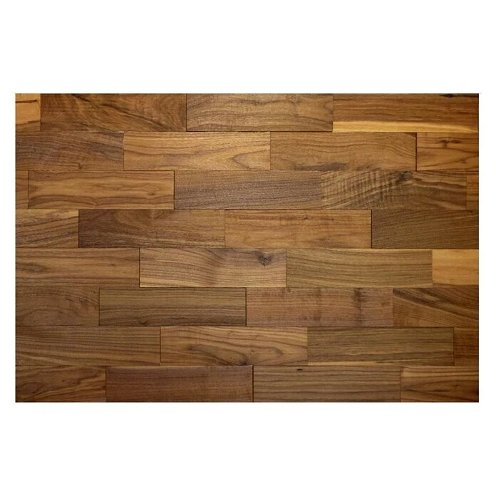 Die Wodewa Echtholzriemchen aus Nussbaum bieten jede Menge Möglichkeiten für die individuelle Innenraumgestaltung mit Holz. Mit der 3D-Holzdekoration gelingt es schnell und einfach Zimmerwände zu gestalten. Die Anwendung ist sowohl für große Flächen als auch kleine Akzente geeignet. Das Anbringen der Massivholzwandverkleidung ist auf allen tragfähigen, glatten und festen Untergründen möglich. Eine optimale Tiefenimprägnierung durch modernste Fertigungstechnik mit mehrmaligem Auftrag gewährleistet einen zuverlässigen Oberflächenschutz vor Feuchtigkeit und Verschmutzung. Die Wodewa Holzwandverkleidung kann mit einem weichen feuchten Tuch, einem Staubwedel oder durch Absaugen einfach gereinigt werden. Dank der drei verschiedenen Materialstärken entsteht eine außergewöhnliche 3D-Optik. Die freie Verlegung garantiert ein Unikat als Fläche. Natürliche Wuchsmerkmale und Farbabweichungen sind ein Beweis dafür, dass es sich um echtes Holz handelt.