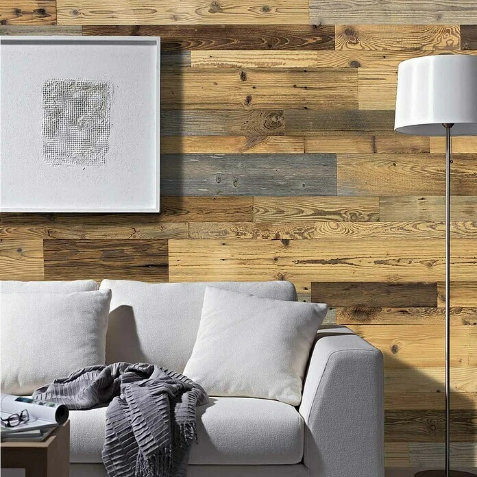 Die Wodewa Echtholzriemchen aus Kiefer Altholz bieten jede Menge Möglichkeiten für die individuelle Innenraumgestaltung mit Holz. Mit der 3D-Holzdekoration gelingt es schnell und einfach Zimmerwände zu gestalten. Die Anwendung ist sowohl für große Flächen als auch kleine Akzente geeignet. Das Anbringen der Massivholzwandverkleidung ist auf allen tragfähigen, glatten und festen Untergründen möglich. Anstatt den Rohstoff zu vernichten, wird das alte Kiefernholz aufbereitet, getrocknet und letztendlich zu einer Wandverkleidung verarbeitet. Das Kiefern Altholz hat eine einmalig unverkennbare Optik, die durch sein Alter und unterschiedlichen Witterungsbedingungen entsteht. Verfärbungen, markante Maserungen und strukturierten Oberflächen unterstreichen das Alter und somit die Wertigkeit und den rustikalen Charakter des Altholzes. Durch die verschiedenen Stärken der Paneele entsteht eine wunderschöne 3D-Optik, die diese Wandverkleidung zu einem natürlichen Hingucker in jeder Inneneinrichtung werden lässt.
