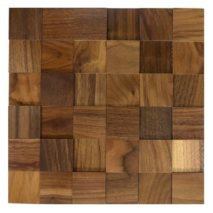 Das Wodewa Holzmosaik Nussbaum wird aus amerikanischem Nussbaum produziert. Speziell die Struktur und geflammte Maserung, die sich deutlich von der Hell- bis dunkelbraunen Farbe abhebt, prägt das ausdrucksstarke Erscheinungsbild der Holzart. Das Mosaik Design aus Nussbaum verleiht Räumen als Wandverkleidung, sowie auch als Boden einen natürlichen, warmen und edlen Charakter. Jedes einzelne Holzmosaik wird auf eine selbstklebende Matte, sauber und sicher verklebt. Dabei werden 36 einzelnen Holzmosaike zu einer Matte verklebt. Ohne weitere zusätzliche Materialien wie Schrauben, Kleber oder Nägel erfolgt die Montage schnell und einfach. Jede einzelne Mosaikmatte ist durch die natürlichen Farb- und Strukturunterschiede und die aufwendige handverlese Verarbeitung der einzelnen Echtholzmosaik ein Unikat. Das einzigartige Design wird durch die einzelnen 3D Mosaike in 2, 4 und 6 mm Stärke geprägt.