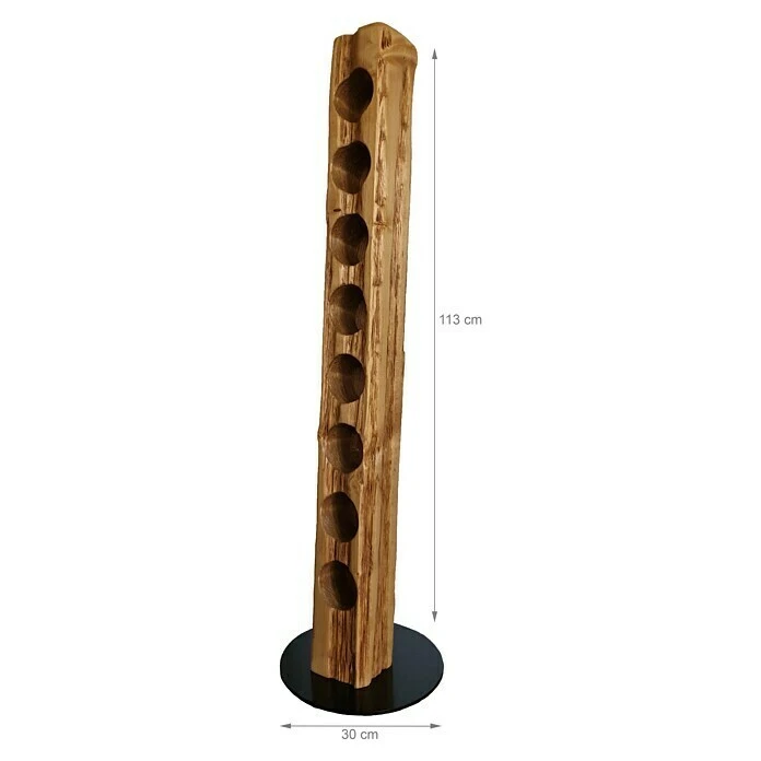 Dieser aus Massivholz in deutscher Handarbeit künstlich auf alt gestylte Weinständer, welcher sich nahtlos in jede Einrichtung einfügt, ist, aufgrund seiner ihm verliehenen Struktur, ein Unikat. Er eignet sich ideal als Geschenk für jeden Weinliebhaber oder für die perfekte Präsentation Ihres guten Weines. Die unterschiedlichen Narben, Risse und Einkerbungen verleihen dem Weinregal seine individuelle Note mit eigenem Charme und Charakter. Dieser Weinhalter weist eine Höhe von 113 cm und einen Durchmesser von 30 cm auf. Er bietet Platz für 8 Weinflaschen bei einem stabilen Stand auf einer runden, schwarz lackierten Stahlplatte. Die Flaschenhalterungen sind für Flaschen bis zu 80 mm Durchmesser (handelsübliche 0,75 l Flaschen) vorgesehen und bieten zudem mit ca. 8 cm Bohrtiefe einen stabilen Halt.