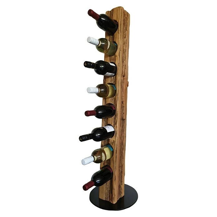 Dieser aus Massivholz in deutscher Handarbeit künstlich auf alt gestylte Weinständer, welcher sich nahtlos in jede Einrichtung einfügt, ist, aufgrund seiner ihm verliehenen Struktur, ein Unikat. Er eignet sich ideal als Geschenk für jeden Weinliebhaber oder für die perfekte Präsentation Ihres guten Weines. Die unterschiedlichen Narben, Risse und Einkerbungen verleihen dem Weinregal seine individuelle Note mit eigenem Charme und Charakter. Dieser Weinhalter weist eine Höhe von 113 cm und einen Durchmesser von 30 cm auf. Er bietet Platz für 8 Weinflaschen bei einem stabilen Stand auf einer runden, schwarz lackierten Stahlplatte. Die Flaschenhalterungen sind für Flaschen bis zu 80 mm Durchmesser (handelsübliche 0,75 l Flaschen) vorgesehen und bieten zudem mit ca. 8 cm Bohrtiefe einen stabilen Halt.