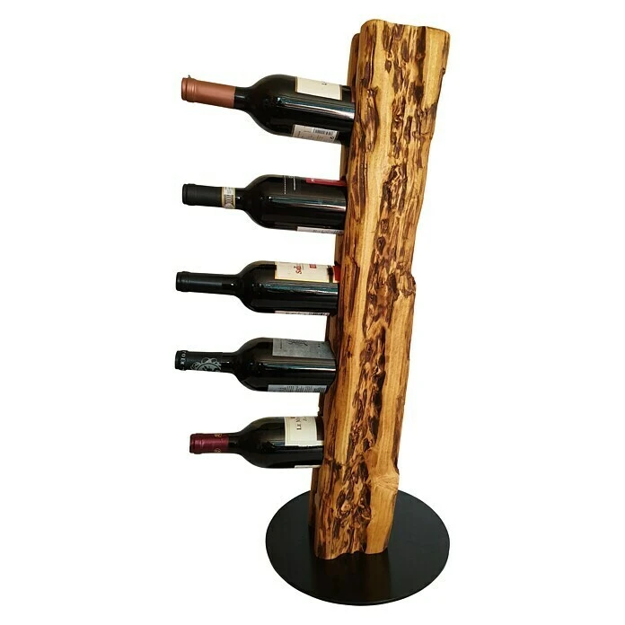 Dieser aus Massivholz in deutscher Handarbeit künstlich auf alt gestylte Weinständer, welcher sich nahtlos in jede Einrichtung einfügt, ist, aufgrund seiner ihm verliehenen Struktur, ein Unikat. Er eignet sich ideal als Geschenk für jeden Weinliebhaber oder für die perfekte Präsentation Ihres guten Weines. Die unterschiedlichen Narben, Risse und Einkerbungen verleihen dem Weinregal seine individuelle Note mit eigenem Charme und Charakter. Dieser Weinhalter weist eine Höhe von 78 cm und einen Durchmesser von 30 cm auf. Er bietet Platz für bis zu 5 Weinflaschen bei stabilem Stand auf einer runden, schwarz lackierten Stahlplatte; die Flaschenhalterungen sind für Flaschen bis zu 80 mm Durchmesser (handelsübliche 0,75 l Flaschen) vorgesehen und bieten zudem mit ca. 8 cm Bohrtiefe einen stabilen Halt.
