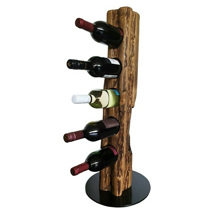 Dieser aus Massivholz in deutscher Handarbeit künstlich auf alt gestylte Weinständer, welcher sich nahtlos in jede Einrichtung einfügt, ist, aufgrund seiner ihm verliehenen Struktur, ein Unikat. Er eignet sich ideal als Geschenk für jeden Weinliebhaber oder für die perfekte Präsentation Ihres guten Weines. Die unterschiedlichen Narben, Risse und Einkerbungen verleihen dem Weinregal seine individuelle Note mit eigenem Charme und Charakter. Dieser Weinhalter weist eine Höhe von 78 cm und einen Durchmesser von 30 cm auf. Er bietet Platz für bis zu 5 Weinflaschen bei stabilem Stand auf einer runden, schwarz lackierten Stahlplatte; die Flaschenhalterungen sind für Flaschen bis zu 80 mm Durchmesser (handelsübliche 0,75 l Flaschen) vorgesehen und bieten zudem mit ca. 8 cm Bohrtiefe einen stabilen Halt.