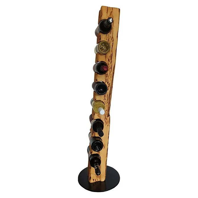 Dieser aus Massivholz in deutscher Handarbeit künstlich auf alt gestylte Weinständer, welcher sich nahtlos in jede Einrichtung einfügt, ist, aufgrund seiner ihm verliehenen Struktur, ein Unikat. Er eignet sich ideal als Geschenk für jeden Weinliebhaber oder für die perfekte Präsentation Ihres guten Weines. Die unterschiedlichen Narben, Risse und Einkerbungen verleihen dem Weinregal seine individuelle Note mit eigenem Charme und Charakter. Dieser Weinhalter weist eine Höhe von 113 cm und einen Durchmesser von 30 cm auf. Er bietet Platz für bis zu 8 Weinflaschen bei einem stabilen Stand auf einer runden, schwarz lackierten Stahlplatte. Die Flaschenhalterungen mit einem Ø von 80 mm sind speziell für handelsübliche 0,75 l Weinflaschen vorgesehen. Wir empfehlen Flaschen mit einem Ø von 68 – 80 mm zu verwenden.