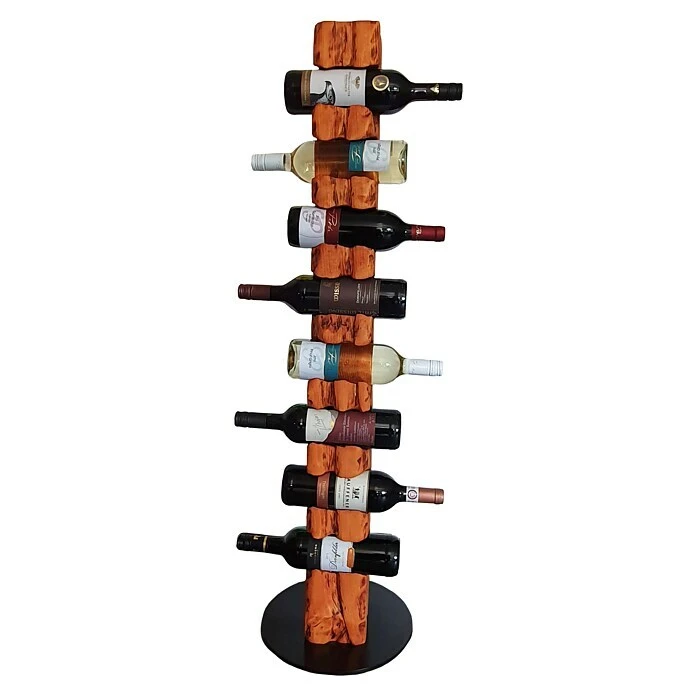 Dieser aus Massivholz in deutscher Handarbeit künstlich auf alt gestylte Weinständer, welcher sich nahtlos in jede Einrichtung einfügt, ist, aufgrund seiner ihm verliehenen Struktur, ein Unikat. Er eignet sich ideal als Geschenk für jeden Weinliebhaber oder für die perfekte Präsentation Ihres guten Weines. Die unterschiedlichen Narben, Risse und Einkerbungen verleihen dem Weinregal seine individuelle Note mit eigenem Charme und Charakter. Dieser Weinhalter weist eine Höhe von 113 cm und einen Durchmesser von 30 cm auf. Er bietet Platz für bis zu 8 Weinflaschen bei einem stabilen Stand auf einer runden, schwarz lackierten Stahlplatte. Die Flaschenhalterungen mit einem Ø von 80 mm sind speziell für handelsübliche 0,75 l Weinflaschen vorgesehen. Wir empfehlen Flaschen mit einem Ø von 68 – 80 mm zu verwenden.
