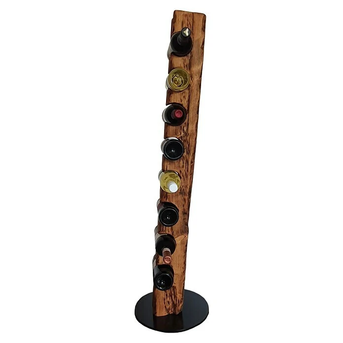 Dieser aus Massivholz in deutscher Handarbeit künstlich auf alt gestylte Weinständer, welcher sich nahtlos in jede Einrichtung einfügt, ist, aufgrund seiner ihm verliehenen Struktur, ein Unikat. Er eignet sich ideal als Geschenk für jeden Weinliebhaber oder für die perfekte Präsentation Ihres guten Weines. Die unterschiedlichen Narben, Risse und Einkerbungen verleihen dem Weinregal seine individuelle Note mit eigenem Charme und Charakter. Dieser Weinhalter weist eine Höhe von 113 cm und einen Durchmesser von 30 cm auf. Er bietet Platz für bis zu 8 Weinflaschen bei einem stabilen Stand auf einer runden, schwarz lackierten Stahlplatte. Die Flaschenhalterungen mit einem Ø von 80 mm sind speziell für handelsübliche 0,75 l Weinflaschen vorgesehen. Wir empfehlen Flaschen mit einem Ø von 68 – 80 mm zu verwenden.