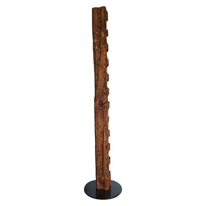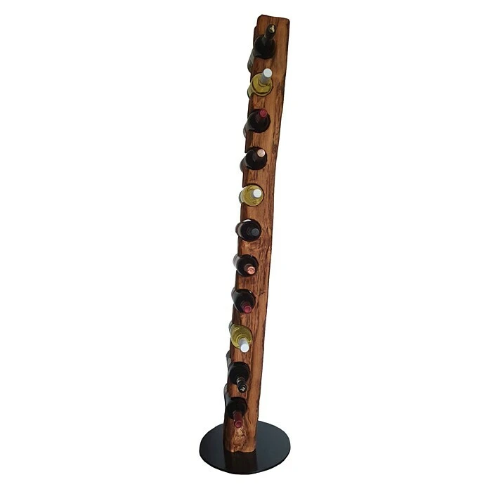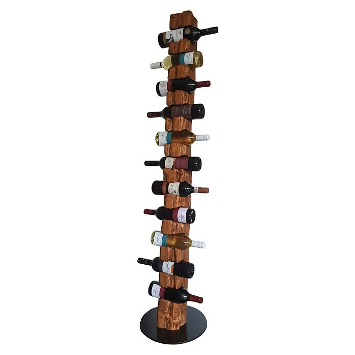 Dieser aus Massivholz in deutscher Handarbeit künstlich auf alt gestylte Weinständer, welcher sich nahtlos in jede Einrichtung einfügt, ist, aufgrund seiner ihm verliehenen Struktur, ein Unikat. Er eignet sich ideal als Geschenk für jeden Weinliebhaber oder für die perfekte Präsentation Ihres guten Weines. Die unterschiedlichen Narben, Risse und Einkerbungen verleihen dem Weinregal seine individuelle Note mit eigenem Charme und Charakter. Dieser Weinhalter weist eine Höhe von 158 cm und einen Durchmesser von 34 cm auf. Er bietet Platz für bis zu 11 Weinflaschen bei einem stabilen Stand auf einer runden, schwarz lackierten Stahlplatte. Die Flaschenhalterungen mit einem Ø von 80 mm sind speziell für handelsübliche 0,75 l Weinflaschen vorgesehen. Wir empfehlen Flaschen mit einem Ø von 68 – 80 mm zu verwenden.
