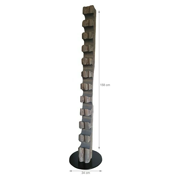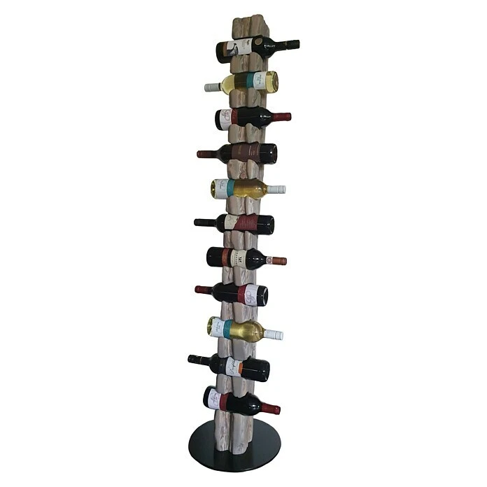 Dieser aus Massivholz in deutscher Handarbeit künstlich auf alt gestylte Weinständer, welcher sich nahtlos in jede Einrichtung einfügt, ist, aufgrund seiner ihm verliehenen Struktur, ein Unikat. Er eignet sich ideal als Geschenk für jeden Weinliebhaber oder für die perfekte Präsentation Ihres guten Weines. Die unterschiedlichen Narben, Risse und Einkerbungen verleihen dem Weinregal seine individuelle Note mit eigenem Charme und Charakter. Dieser Weinhalter weist eine Höhe von 158 cm und einen Durchmesser von 34 cm auf. Er bietet Platz für bis zu 11 Weinflaschen bei einem stabilen Stand auf einer runden, schwarz lackierten Stahlplatte. Die Flaschenhalterungen mit einem Ø von 80 mm sind speziell für handelsübliche 0,75 l Weinflaschen vorgesehen. Wir empfehlen Flaschen mit einem Ø von 68 – 80 mm zu verwenden.