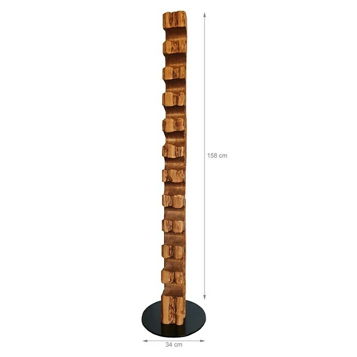 Dieser aus Massivholz in deutscher Handarbeit künstlich auf alt gestylte Weinständer, welcher sich nahtlos in jede Einrichtung einfügt, ist, aufgrund seiner ihm verliehenen Struktur, ein Unikat. Er eignet sich ideal als Geschenk für jeden Weinliebhaber oder für die perfekte Präsentation Ihres guten Weines. Die unterschiedlichen Narben, Risse und Einkerbungen verleihen dem Weinregal seine individuelle Note mit eigenem Charme und Charakter. Dieser Weinhalter weist eine Höhe von 158 cm und einen Durchmesser von 34 cm auf. Er bietet Platz für bis zu 11 Weinflaschen bei einem stabilen Stand auf einer runden, schwarz lackierten Stahlplatte. Die Flaschenhalterungen mit einem Ø von 80 mm sind speziell für handelsübliche 0,75 l Weinflaschen vorgesehen. Wir empfehlen Flaschen mit einem Ø von 68 – 80 mm zu verwenden.